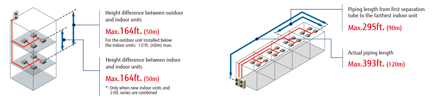 Our advanced refrigerant control technology allows us to achieve a total refrigerant piping length of 1,312ft. (400m). This opens up new possibilities in system design.