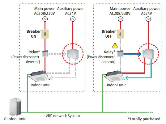 TLAV2 indoor units can be connected to an external power supply. This way, even if some of the indoor units in the system are turned off, the devices in the system can be protected by the external power supply unit.