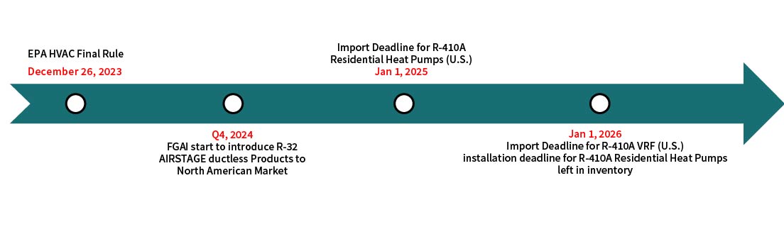 The United States Environmental Protection Agency (EPA) published a final rule(*6) in December 2023 that calls for the end of manufacturing and importing heat pumps and air-conditioners using refrigerants with a GWP higher than 700. As shown on the timeline below, residential products (and Variable Refrigerant Flow (VRF) products with a capacity <65,000 BTU/h) begin with an import deadline for R-410A products in January 2025 and follow up with an installation deadline for R-410A products in January 2026. VRF products have an import deadline set for 2026, while the installation deadline is still due from EPA.