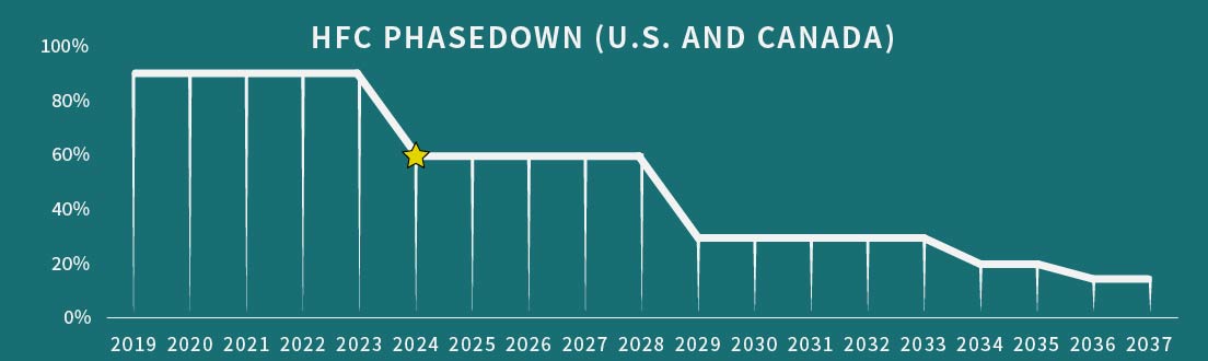 Outside of the HVAC sector GWP limits, there are broader regulations aimed at curbing both the U.S. and Canada’s HFC usage over the next decade. The current HFC phasedown schedule (for the production and consumption of HFCs), shown on page 4, is on schedule for both the U.S. and Canada.