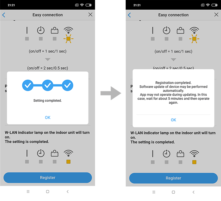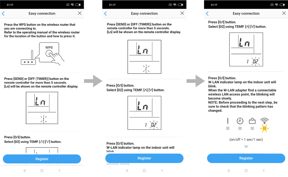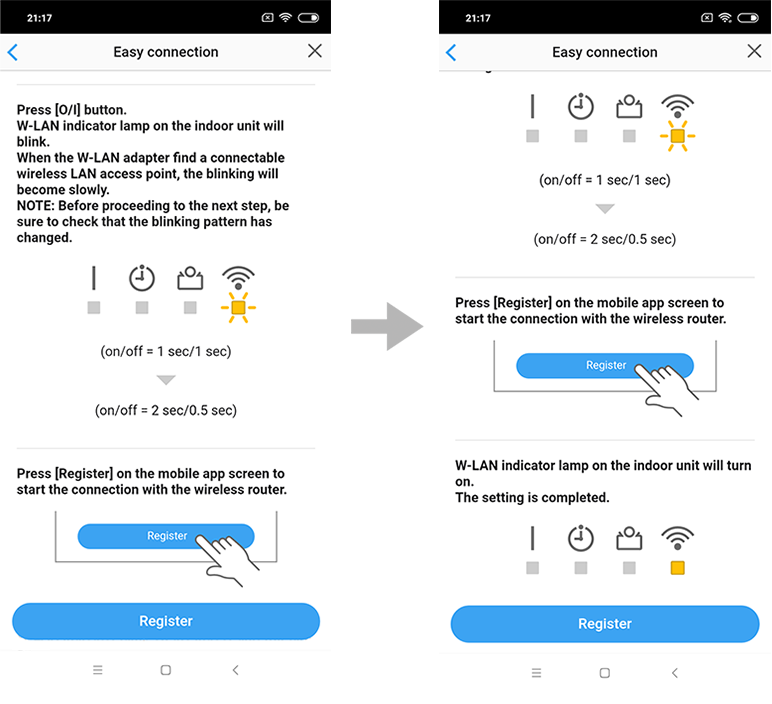 Press [Register] on the screen on the mobile app to start the connection with the wireless router.