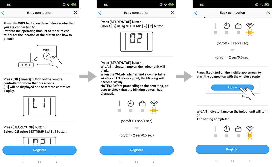 Press [Register] on the screen on the mobile app to start the connection with the wireless router.