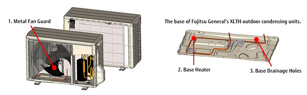 When temperatures reach 36ºF, a built-in heater warms the base of the outdoor unit so that condensation doesn't freeze. Without a heater, freezing condensate can cause noise, damage to the fan blade, condenser, and system performance.